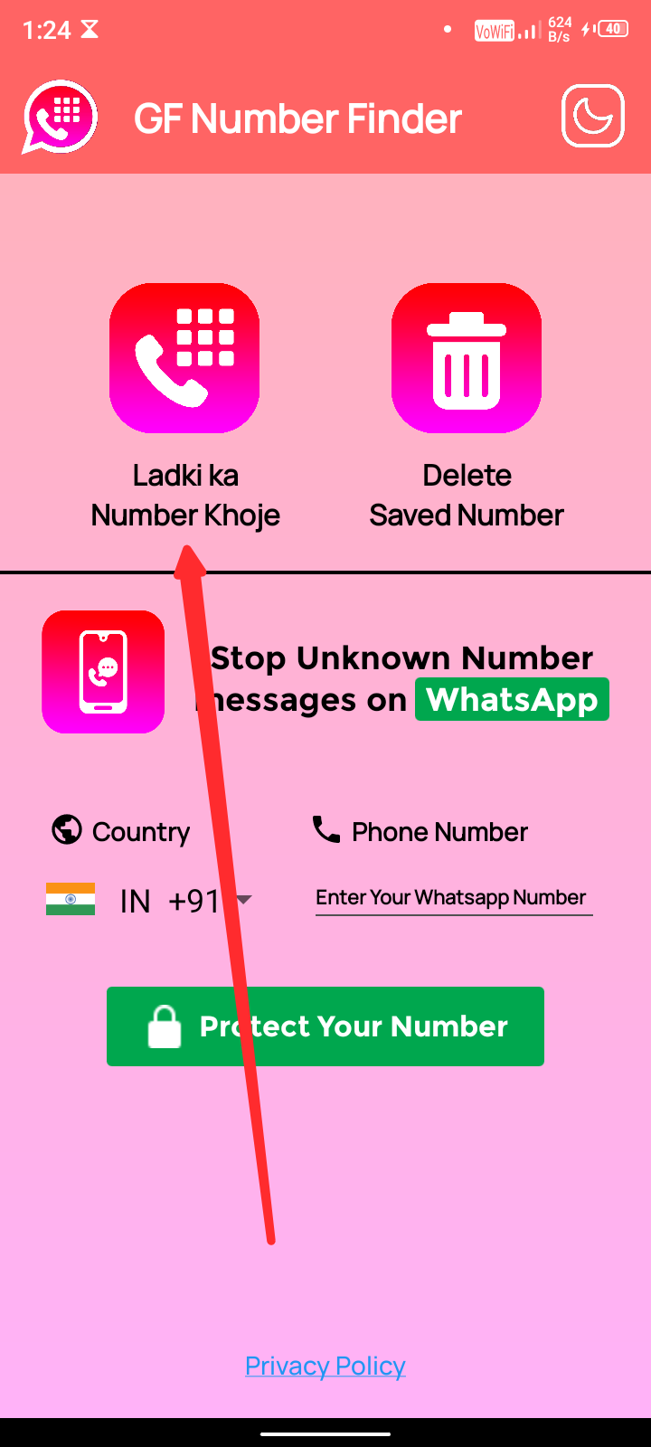 परमिशन देने के बाद एप्लीकेशन के होम पेज पर आ पाएंगे यहां पर आपको दो ऑप्शन मिलेंगे ladki ka number khojen second delete saved number आप पहले ऑप्शन लड़की का नंबर खोजें पर क्लिक करें।