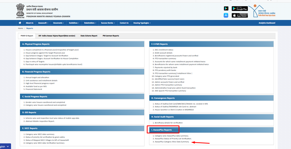 Website ओपन करने के बाद आप सीधे यह पेज पर आ जाएंगे यहां पर आने के बाद आपको सबसे नीचे I. AwaasPlus Reports यह ऑप्शन में से Third ऑप्शन इस पर AwaasPlus Category-Wise Data Summary. क्लिक करना हैं,