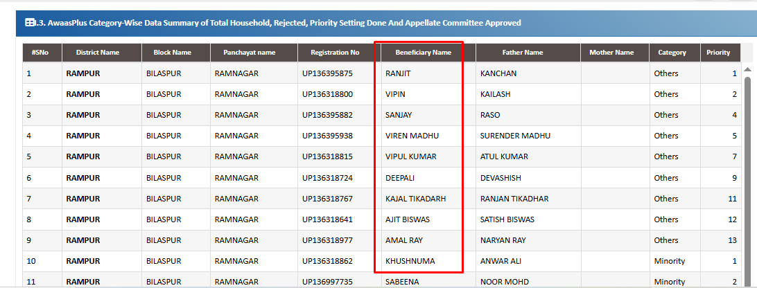 इस लिस्ट में उन व्यक्ति के नाम शामिल हैं जिसका सर्वेक्षण सफलतापूर्वक हो गया है यहां पर आप beneficiary name कॉलम में अपना नाम देख सकते हैं।