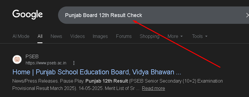 गूगल ओपन करने के बाद सर्च ऑप्शन में punjab board 12th result check लिखकर सर्च करना है।