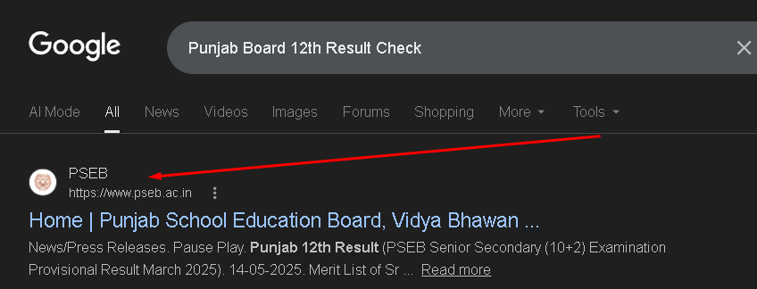 अब आपके सामने पंजाब बोर्ड की ऑफीशियली वेबसाइट सबसे ऊपर Show होगी PSEB वेबसाइट को क्लिक करके ओपन कर लें।