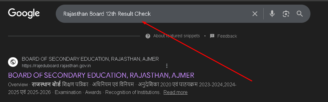 गूगल पर आने के बाद आपको सर्च ऑप्शन पर क्लिक करके Rajasthan board 12th result check लिखकर सर्च करना है, उसके बाद राजस्थान बोर्ड की ऑफिशल वेबसाइट आपके सामने सर्च रिजल्ट में दिख जाएगी यहां वेबसाइट को क्लिक करके ओपन कर लें,